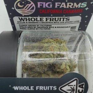A vibrant hybrid bred and pheno-hunted by Fig Farms, Whole Fruits is a cross between Apples & Bananas and (Backpack Boyz × Roundtable), resulting in colorful buds, sticky trichomes, and a complex, sour-funky terpene profile. This strain captures the juicy, fruit-forward sweetness of its Apples & Bananas parent and layers it with gassy undertones and a subtle OG bite for a perfectly balanced experience.